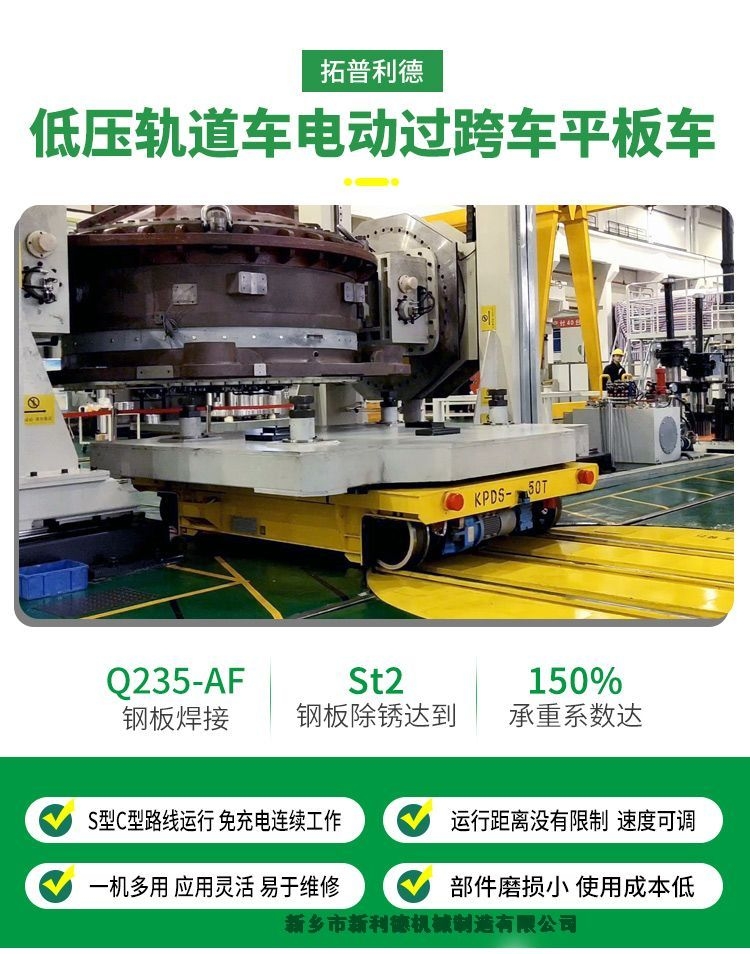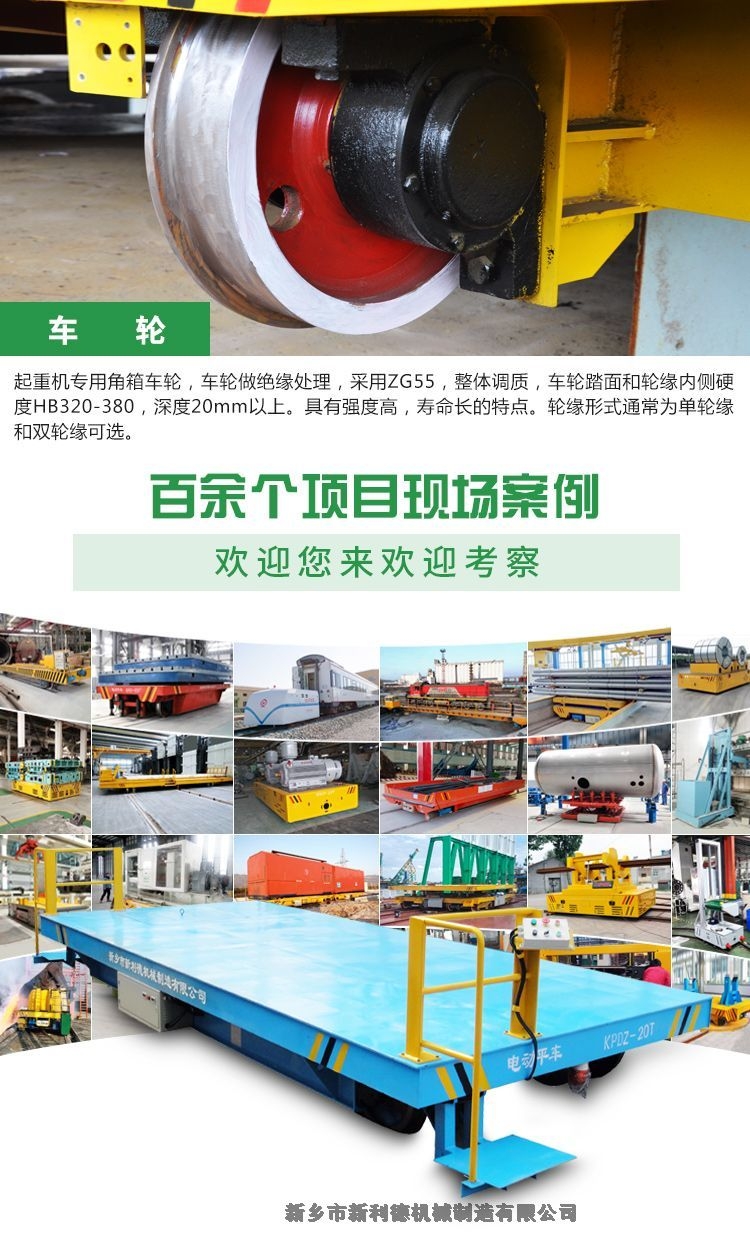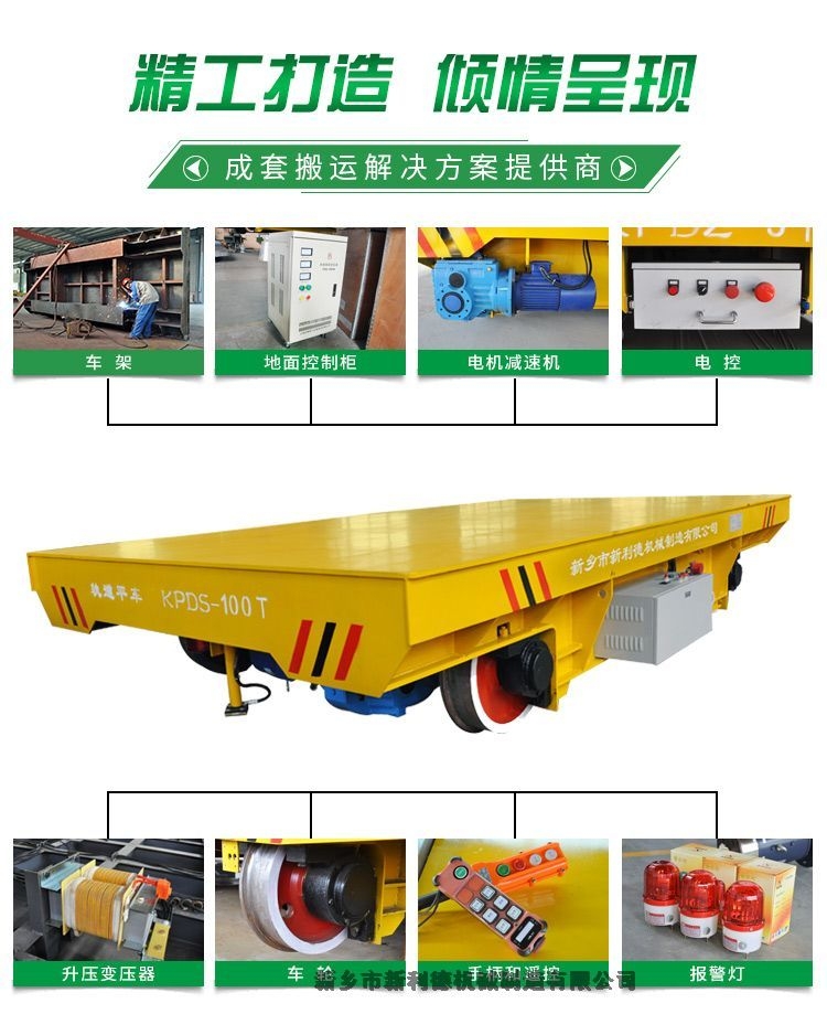 KPDZ系列平车采用直流电机、欧标减速机作为驱动系统,电力来源是带36V电压的轨道,380V的交流电通过降压变压器降压至36V接入轨道,平车的车轮上的取电装置将电流引入平车电器控制箱,电器箱中的电器元件将36V交流电变为36V直流电后,进而供电给平车的直流电机,通过电器控制系统控制平车的前进、后退和停止等。