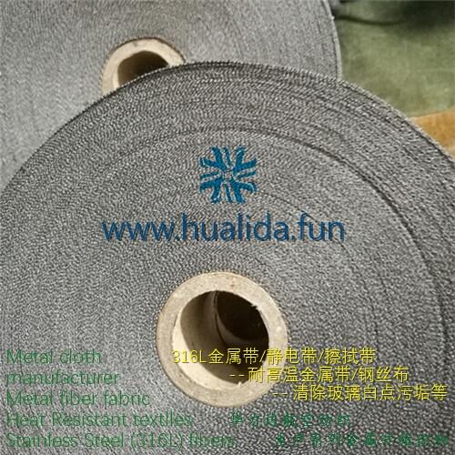 华力达航空纺织科技专业生产316L不锈钢金属纤维制品:316L不锈钢金属纤维纱线、耐高温金属织带,耐高温钢丝布,金属布,特制玻璃擦拭带,静电消除带,工业除静电带,手机盖板垫层耐高温金属布,工业研磨机械擦拭打磨用耐高温金属纤维布钢丝布擦拭除白点残胶污垢等,提高成品率,降低客户生产成本。由316L不锈钢纤维纱线织成的纯金属纺织品。该产品不仅具备普通纺织品的柔软性、高强度,耐高温燃烧领域使用、阻燃、不燃、导电、消除静电、屏蔽电磁波、防辐射纺织品用材等,耐切割、耐腐蚀、耐磨擦、柔软减震。产品适用于高温吸音、耐高温领域、医疗、工业、玻璃、电子领域、印刷、复印机、电镀、塑料、包装、橡胶行业等,用途。可纺织成各种平纹、斜纹、缎纹机织布和织带,也可做成柔软有弹力的针织布,并能像普通面料一样裁剪和缝制。不锈钢纤维制品的抗热性、耐拉性、良好的缓冲性、耐高温不易打折、对光滑的玻璃有良好的握持性。具有耐高温、柔软、耐用性高、具有高透气度和可延展之特性。汽车玻璃成型之模具包覆材料,是玻璃工业耐高温缓冲材料。不锈钢钢丝布主要用于手机盖板玻璃、平板电脑显示屏、汽车玻璃、液晶玻璃、医疗器皿玻璃等制造厂使用,具有高度柔软性和延展性,可提升玻璃制品外观平滑。