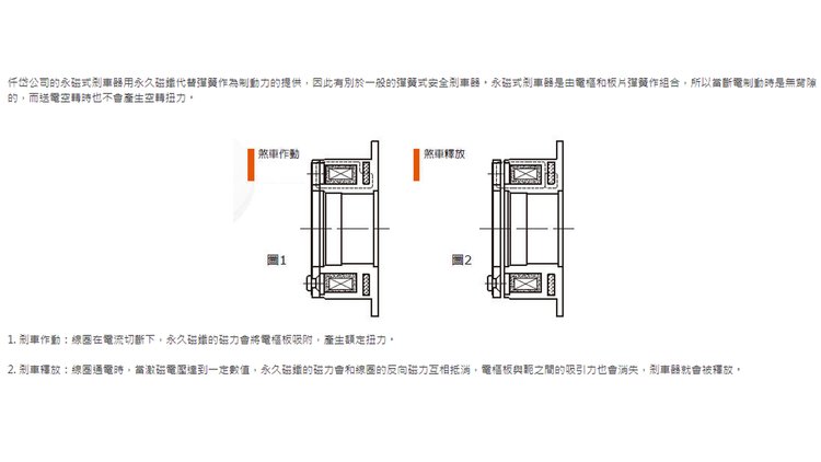 1.反应快速:使用永久磁铁来吸引电枢板作制动,让作动更确实,快速;