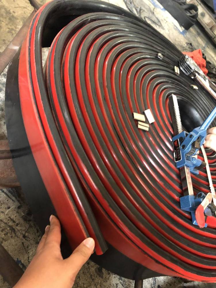 1、裙板材质:采用聚氨酯与橡胶复合而成,与皮带接触部分(起主要密封作用)为聚氨酯。聚氨酯采用粉料浇注而成,比采用挤出工艺制成放入聚氨酯耐磨,使用寿命长,不易伤害皮带。