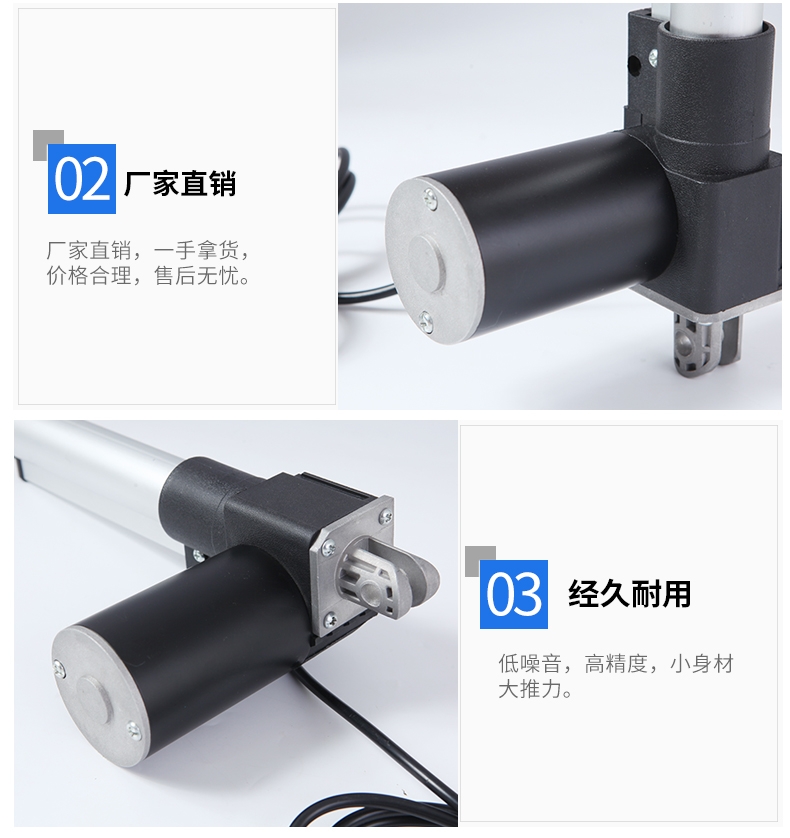 具有节能环保,性能可靠,动作灵敏,运行平稳,推拉力相同,环境适应性好等特点。设计新颖精致、体积小、精度高、完全同步、自锁性能好、卫生,电机直接驱动,不需要管道的气源、油路,现已大量用于生产线、汽车、透气窗开启、军工、舞台、纺织、污水处理等各个行业设备上.