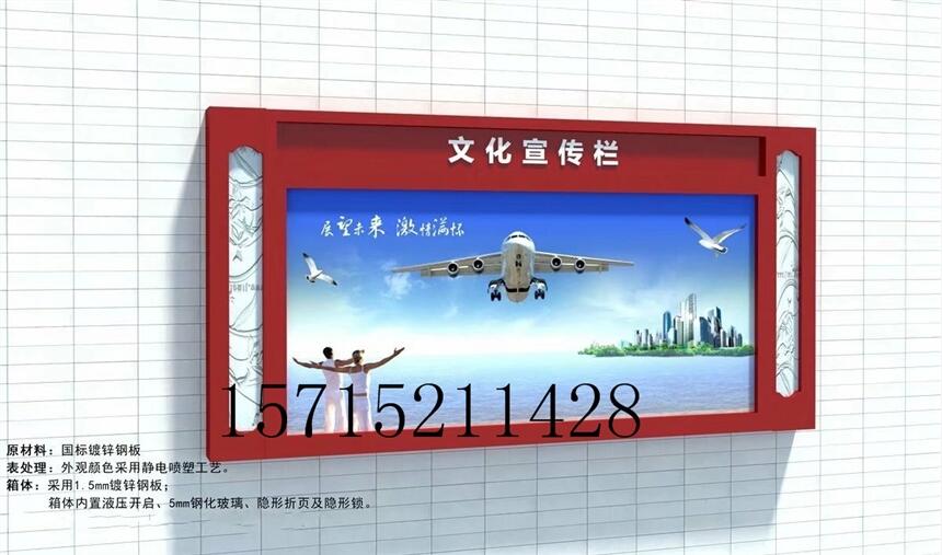 长沙壁挂宣传栏墙上宣传橱窗壁挂式文化长廊我们是宣传栏制作生产厂家为您提供各类定制款室内外宣传栏,广告灯箱,公交候车亭,太阳能灯箱,LED灯箱,旗杆,花草牌,广告机等。产品特点: 1、制作灯箱材料:不锈钢、镀锌钢板.冷轧板、塑钢等; 2、制作面板材料:钢化玻璃、有机玻璃、耐力板等; 3、宣传栏开启方式:液压支撑杆,节省人力,双面开启; 4、宣传栏制作备选设备:滚动系统、路名牌、LED; 5、宣传栏型号外观:结构合理、美观大方、经久耐用; 6、宣传栏规格大小:自由选择、定制; 7、定制滚动功能:可换画2~10幅,画面停留时间可任意设定,自动开关机,自动循环运转 8、箱体数控设备生产,机械精度高,工艺有保证,防水,防尘,抗静电设计; 9、宣传栏外观设计:颜色任选,喷塑、喷漆;挂壁式、落地式、吊装式、组合式;10、定制画面:单面转画、双面转画、单面固定、双面固定;画面材质为高精度数码丝印(防水、防紫外线照射)。 11、宣传栏制作灯箱材质:不锈钢板、镀锌板、冷板烤漆; 12、宣传栏箱体视窗材质:PC耐力板、钢化玻璃。长沙壁挂宣传栏墙上宣传橱窗壁挂式文化长廊