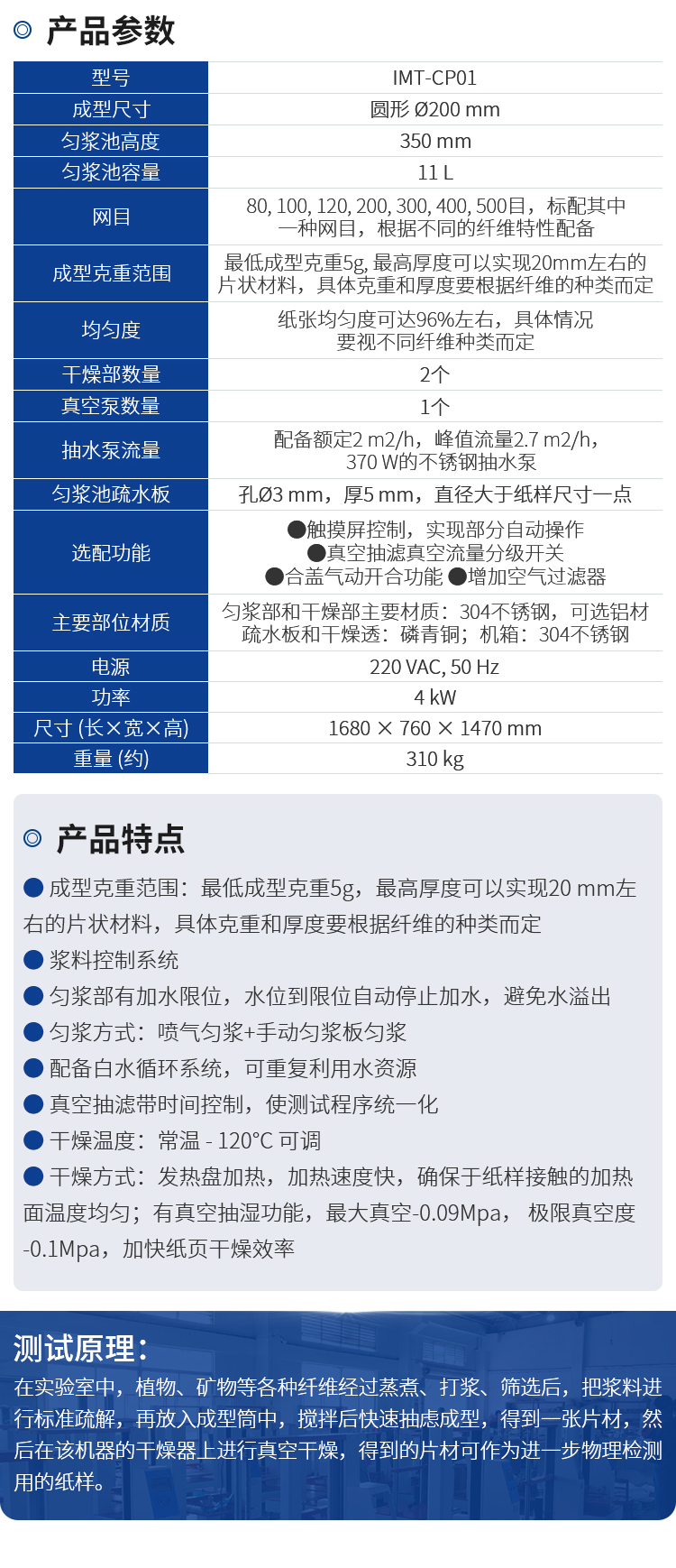 用途 | 快速凯塞法将纸浆抄造成型并且 进行快速真空干燥的实验用设备 | ||