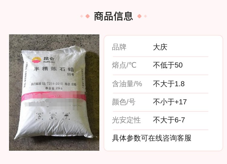 大庆牌半精炼粒蜡蜡烛原料火焰集中化学稳定用途广泛