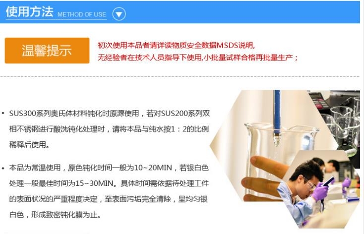 应用不锈钢酸洗钝化适合200系列、300系列、400系列不锈钢, 广泛用于化工、制药、造纸、食品、航空、核工业、建筑等不锈钢设备、压力容器、工程构件的表面处理。