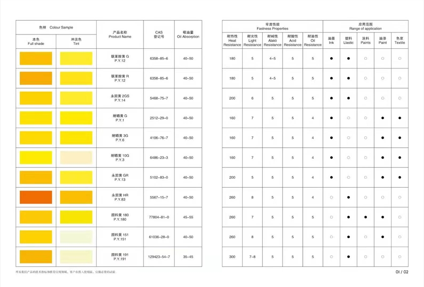 半透明型,耐光牢度优良,低粘度,易分散,储存稳定性好,部分剂型高流动 度,无 荧光,剂型不同有高透明和高遮盖力之分,分为红光黄和绿光黄两种