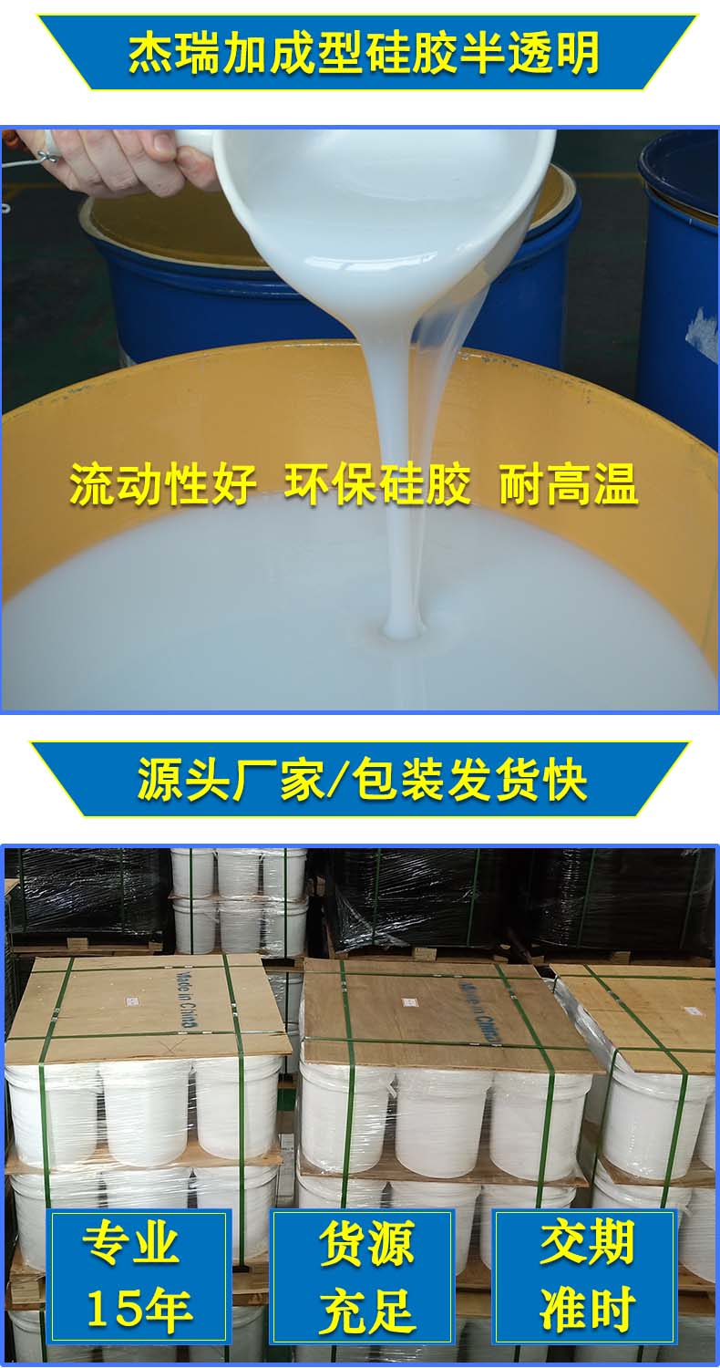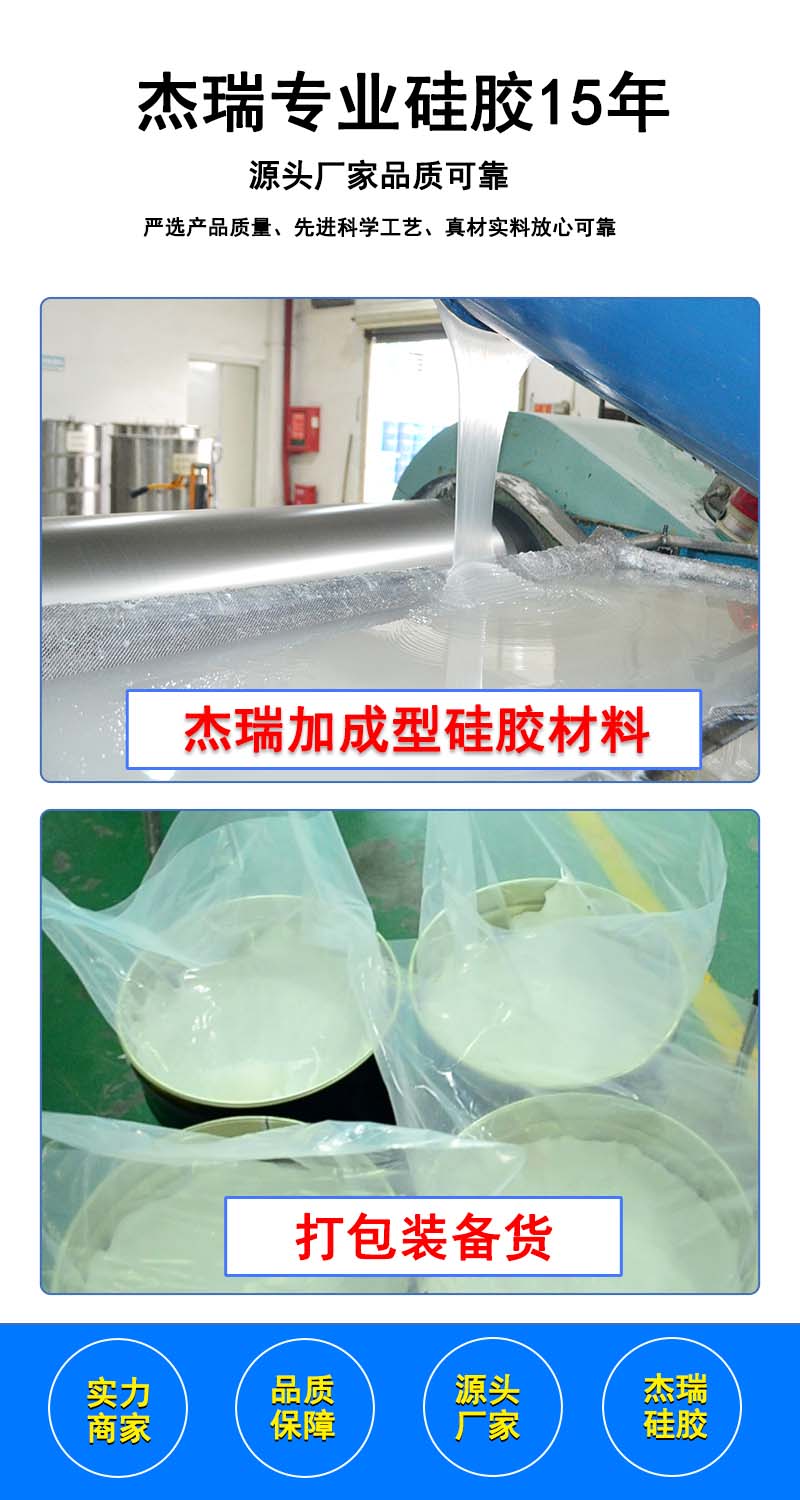 JR- E系列硅胶也叫做加成型铂金硅胶,是双组份加成型有机硅材料。由两部分组成:A组分是硅胶,B组分是固化剂;两组分按1:1的比例混合配比。本品为半透明油状液体,可室温固化也可加温固化。