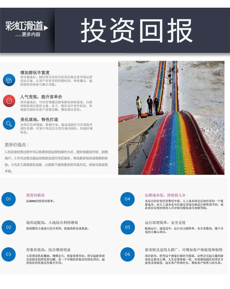 彩虹滑道属于一般园区都能投得起的项目,其建设周期要根据投资规模来决定,无需太长的等待期即可完成建设投产,快速进入经营期产生经营收益。从其建设成本、经济效益、特色价值等综合来看,具有性价比。
