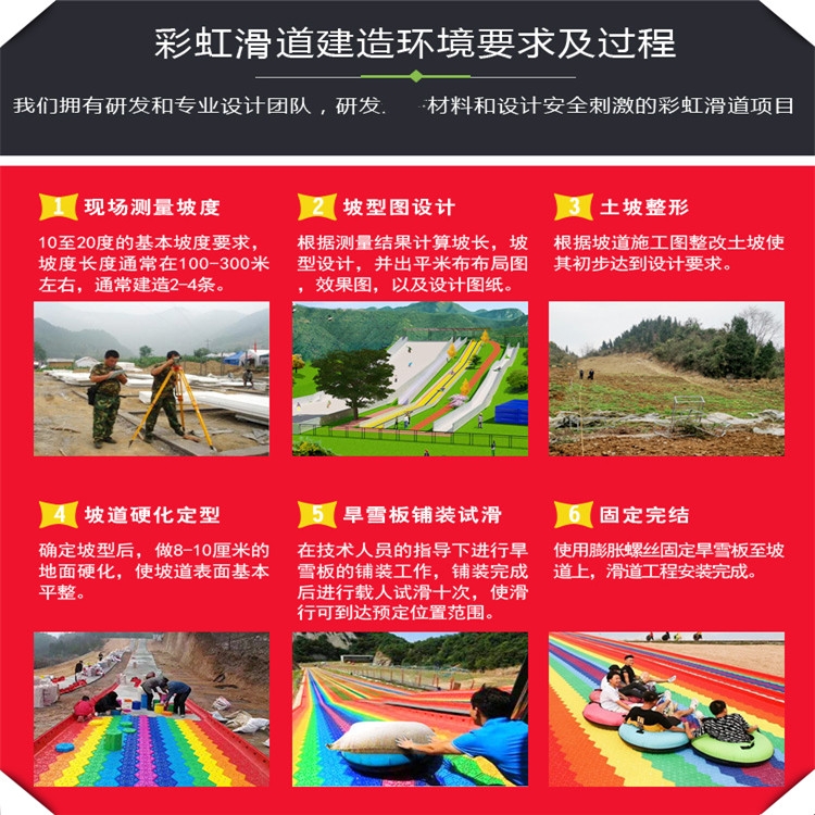 有坡度的地方修一条或几条彩虹滑道滑道,一年四季都可以游乐,安装简单快捷,投资小回报高,刺激好玩,是投资者 值得投资的项目。也成为市民喜爱的户外运动之一。