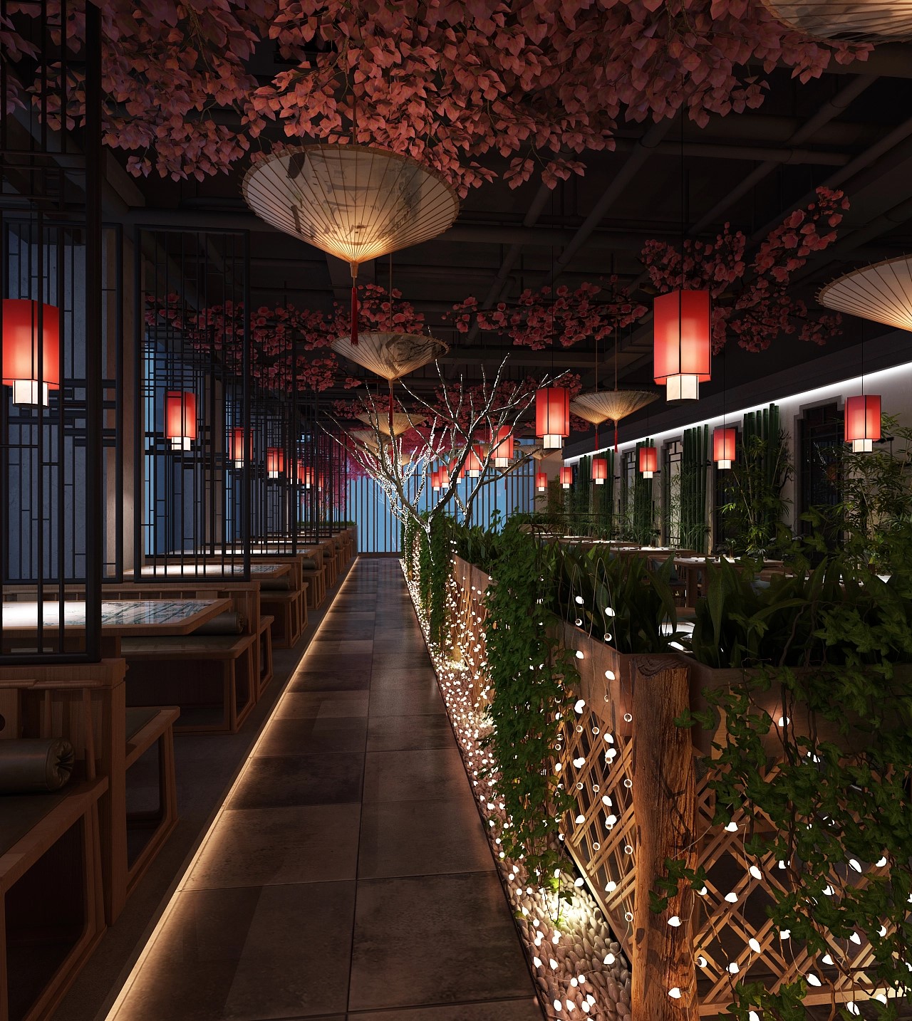 照明设计:中餐厅的照明设计应该注重营造温馨、舒适的氛围。可以选择一些传统的灯具,如纸灯笼、雕花吊灯等,来增强空间的中式氛围。同时,也可以运用一些现代照明设备,如筒灯、射灯等,来营造舒适的用餐环境。