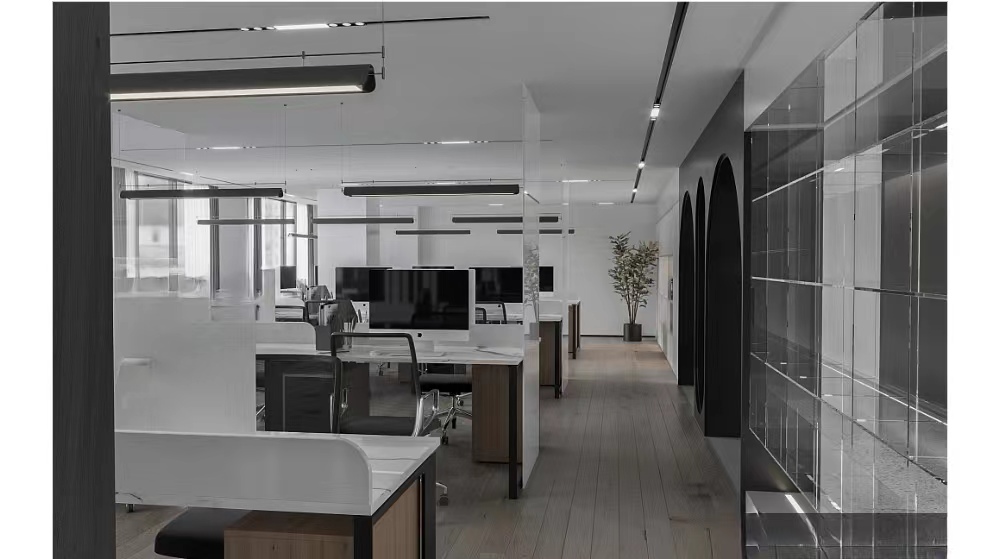 简约家具:选择线条简洁、造型大方的办公家具,如黑色或深灰色的金属或木质桌椅。这些家具既符合整体风格,又具有实用性。在空间中适量添加一些简约的装饰元素,如黑白灰的挂画、摆件或植物。这些元素既能提升空间的美感,又能增添个性化氛围。