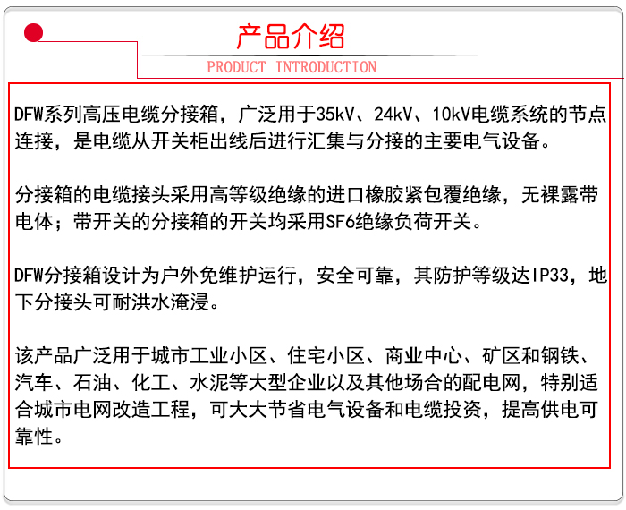 应用范围城市街道、工业小区、住宅小区、商业中心、矿区和钢铁、汽车、石油、化工、水泥等大型企业以及其他场合的配电网,特别适合城市电网改造工程