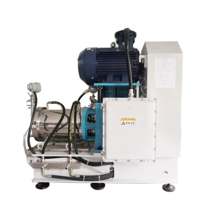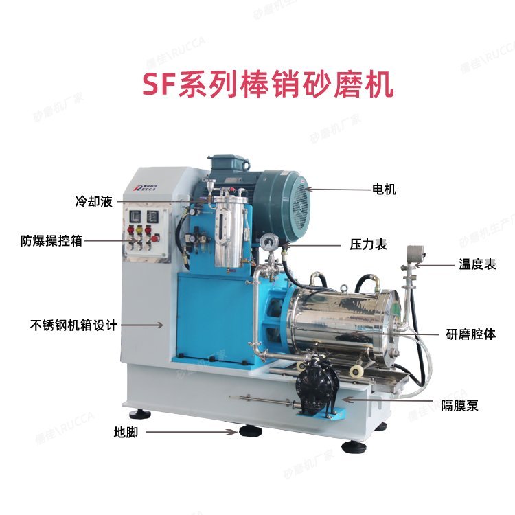??儒佳SF砂磨机的工作原理是利用料泵将经过搅拌机预分散润湿处理后的固-液相混合物料输入筒体内,物料和筒体内的研磨介质一起被高速旋转的分器搅动,从而使物料中的固体 微粒和研磨介质相互间产生更加强烈的碰撞、摩擦、剪切作用,达到加快磨细微粒和分散聚集体的目的。研磨分散后的物料经过动态分离器分离研磨介质,从出料管流出?。