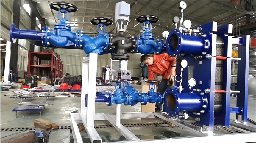 换热机组工作原理:蒸汽或高温水在温控阀控制下,按供热系统所需流量送入板式换热机组,换热器以间接换热方式将热用户的采暖(空调)回水加热;被加热水首先流经不锈钢芯除污器,再经循环泵进入换热器被加热后供用户使用,周而复始。一次热媒在板式换热机组换热后又回至一次供热管网。系统的水量损失由补水泵按设定的压力自动补充,确保系统压力稳定、正常运行。