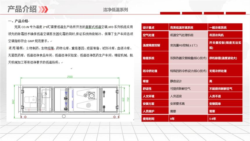COOLING(克英)低温洁净空气处理机组采用德国高等级防冷桥技术彻底解决空调的冷热绝缘,机组以氟冷媒直接蒸发冷却或以低凝固点的乙烯乙二醇水溶液为载冷剂,而在低温空气处理机组中完成热交换。机组除霜采用国际领先的双换热器交替除霜稳定控制系统,确保系统持续制冷送风、新风、洁净保障了低温环境各项空调指标符合GMP规范要求