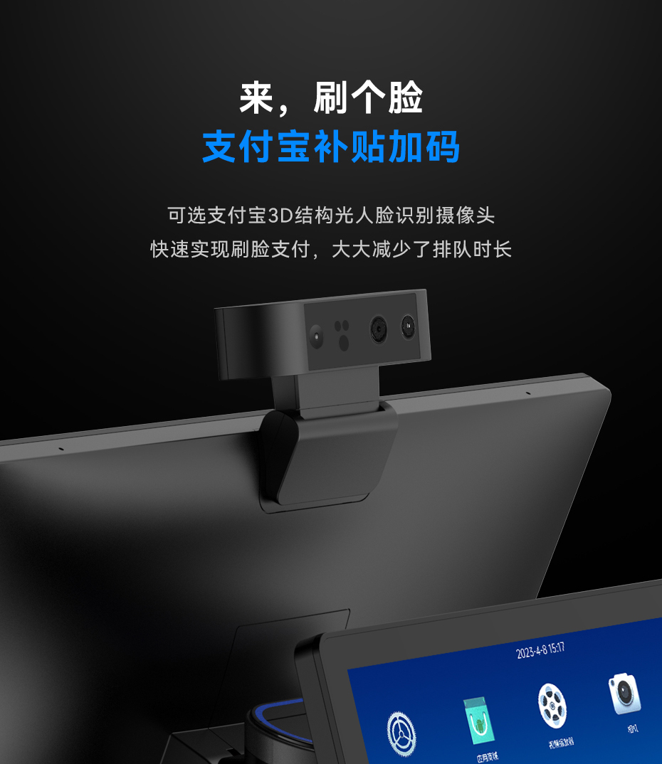 天波零食店AI识别收银机一体机C50A可选支付宝3D结构光人脸识别摄像头,在顾客手拎重物或忘带手机时,可直接刷脸完成支付,带来全新的支付体验,不仅如此客户刷脸支付成功后,代理商还能享受刷脸补贴,支付体验和优惠力度直接拉满。