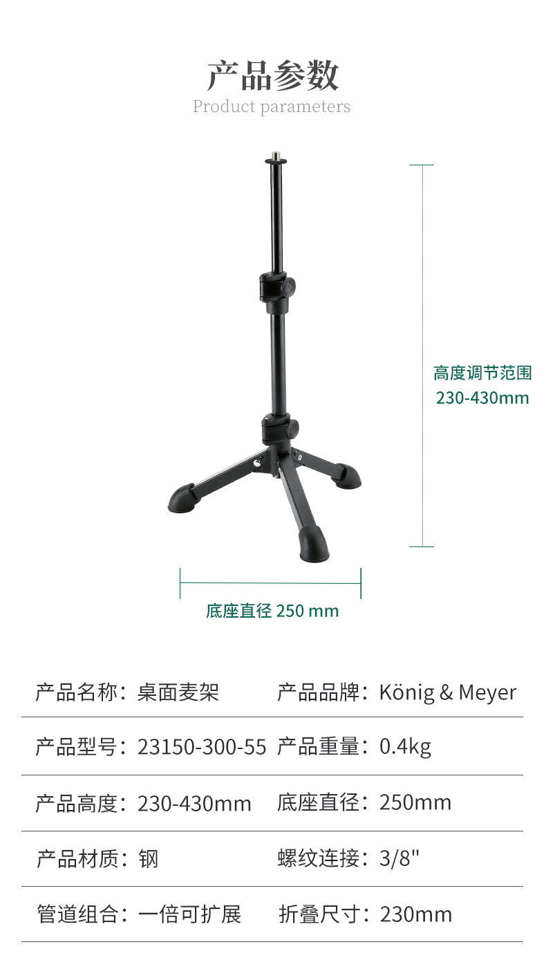 K&M 23150-300-55 桌面麦架 桌面话筒支架 桌面麦克风支架 MIC支架 桌面会议直播主播话筒架 多功能通用桌面三脚架高度可升降相机录像机折叠架