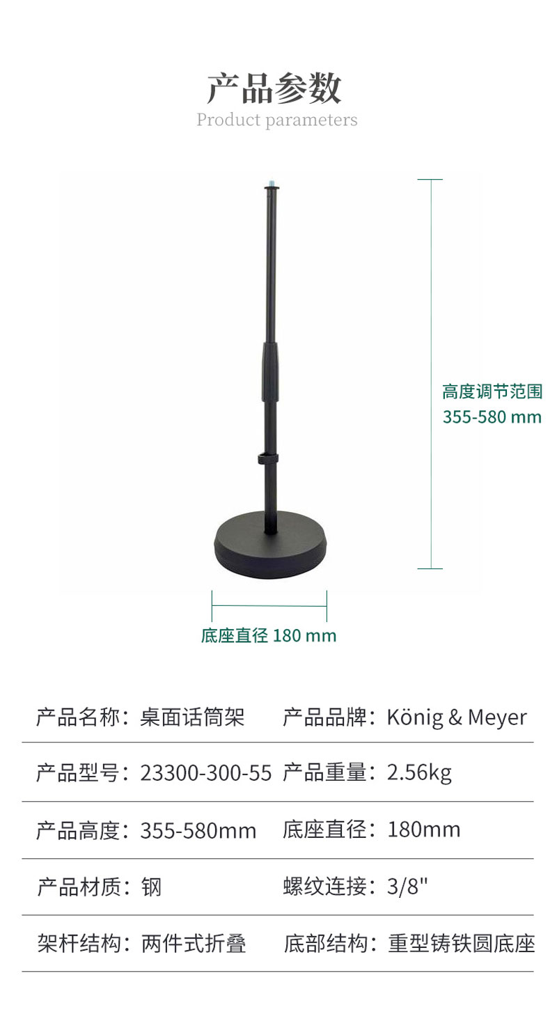 底座直径: 180mm 毫米,高度: 从 355mm 到 580mm 毫米,螺纹接头: 3/8",重量:2.56kg 公斤.组合地板和桌架。带有吸音橡胶嵌件的重型黑色铸铁底座。高度可调的 2 件式管道。
