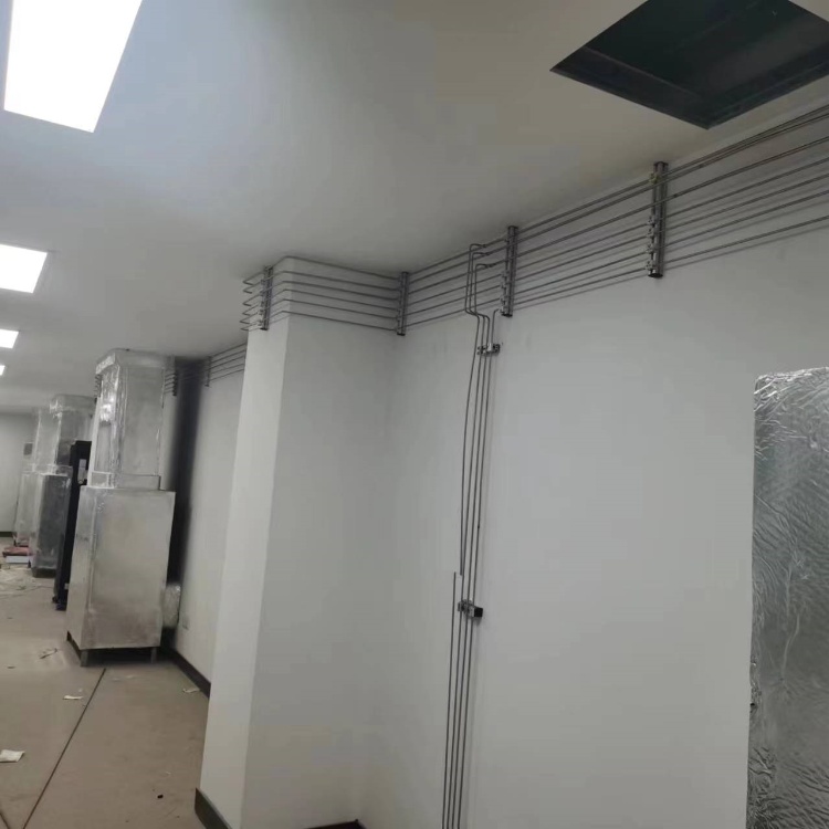 • 管道布置:管道应沿墙或天花板下方进行明设,布置应合理、整齐,避免弯曲或挤压等问题,保证供气管网畅通无阻。气体管路每隔 1.5 米左右应设置支架固定,所有弯曲处也都要有支撑,支架需进行镀锌防腐处理。同时,气体管道不得和电缆、导电线路同架铺设56.