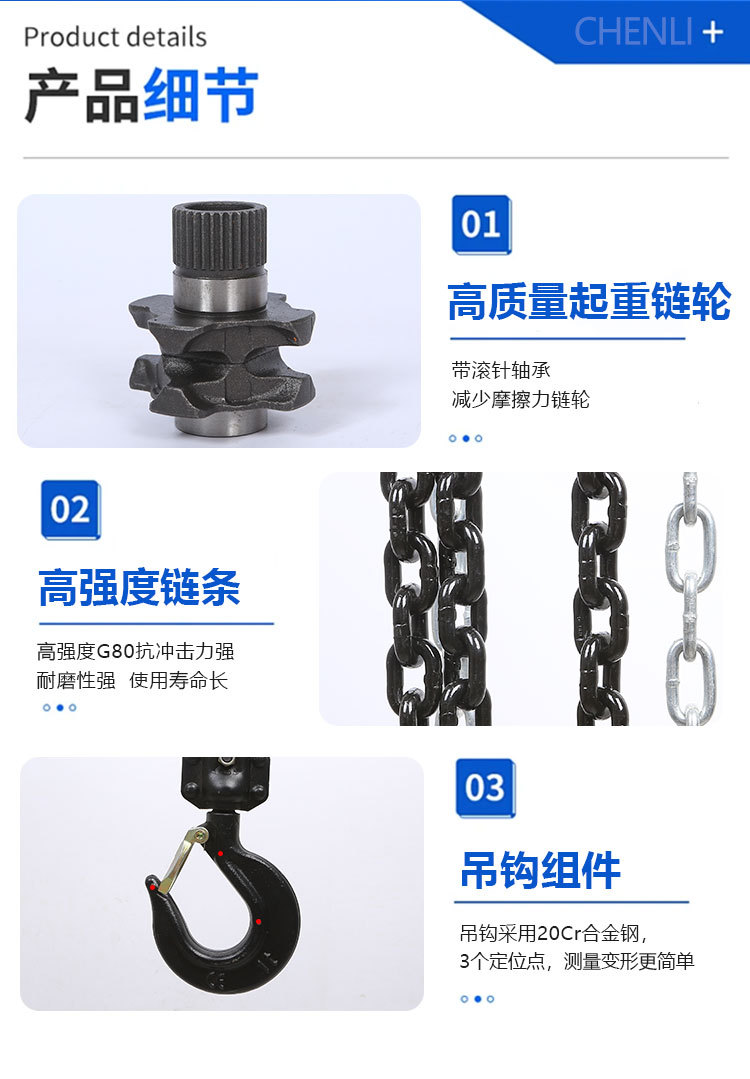1.整体机身采用高强度板材拉伸冲压而成,强度高,左右墙板、外墙板、起重轮带整体轴承,运转灵活,手拉力畅快轻盈;