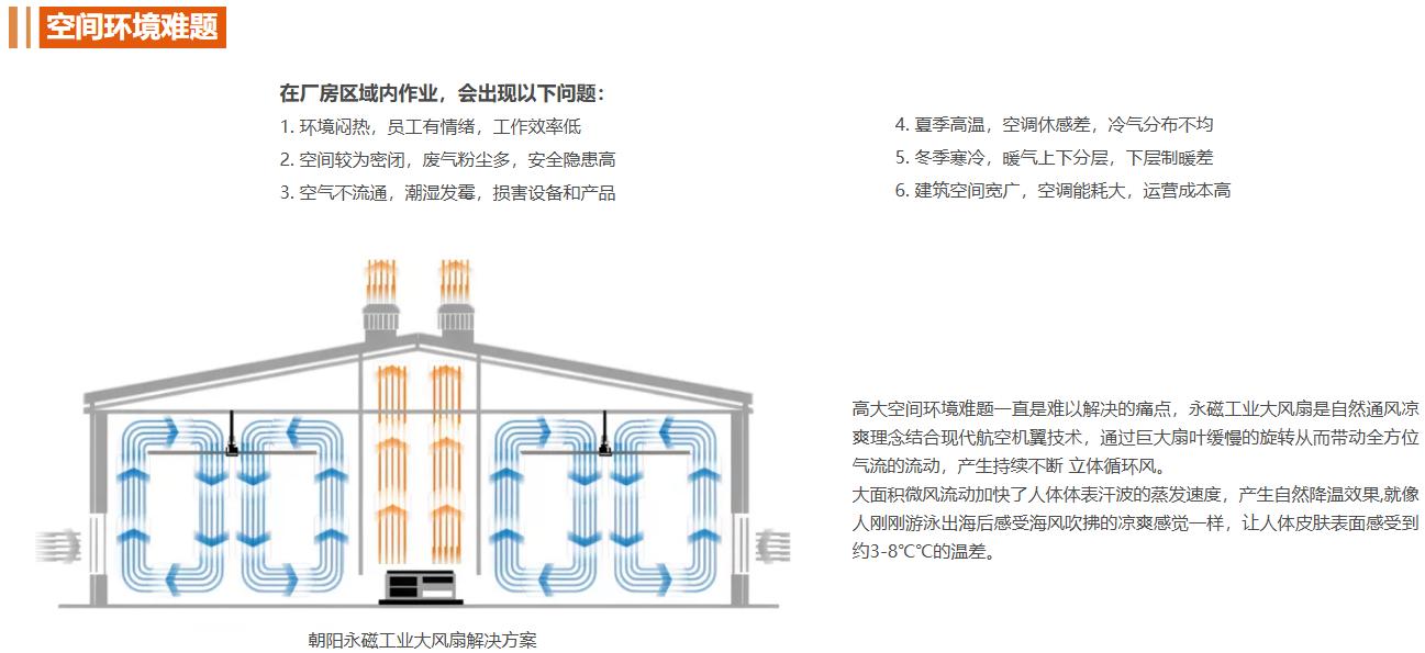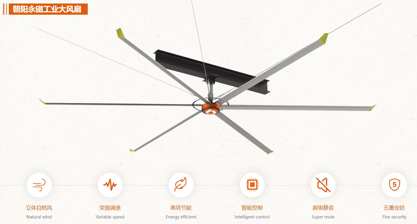 朝阳永磁工业大风扇6大特点:立体自然风,变频调速,高效节能,智能控制,超级静音,五重安防。