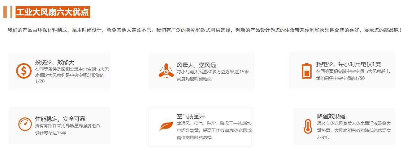 在同等条件及面积安装中央空调与大风扇相比大风扇约是中央空调总投资的1/20;2.风量大,送风远:每小时最大风量80多万立方米,在15米高度均能吹到地面;3.耗电少,每小时用电仅1度:在同等面积安装中央空调与大风扇耗电量约只需中央空调的1/50;4.性能稳定,安全可靠:所有零部件采用高质量高强度组合,设计寿命达15年;5。空气质量好:集通风、换气、除尘、降温于一体,增加空间含氧量,提高工作效率,整体送风或岗位送风随意选择;6.降温效果强:通过立体送风蒸发人体表面汗液吸收大量热量,大风扇能有效的降低体感温度3-8°C。
